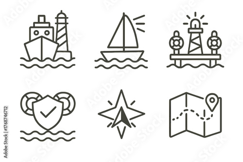 Nautical icons featuring ship, lighthouse, sailboat, pier, shield, compass, and map