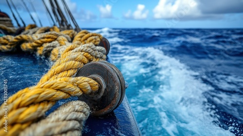 Nautical ropes on a ship's deck, ocean waves, bright sky. Possible use travel, adventure, sailing