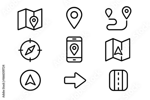 Navigation and Location Icon Set, GPS and Direction Line Icons Collection, Vector Map and Route Symbols, Mobile Location Pins, Compass and Road Arrows, Transparent Background