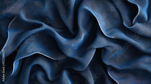 Navy blue textured fabric showcasing elegant folds and intricate knit details for textile and fashion design applications