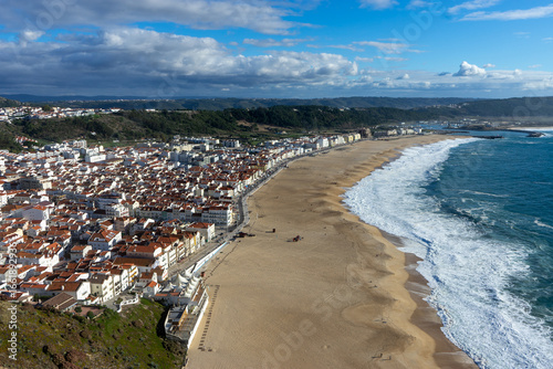 Nazaré, Portugal – Panoramic aerial view of the town with red-roofed houses and wide sandy beach along the Atlantic Ocean