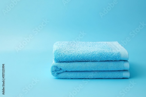Neat stack of light blue bath towels. Perfect for websites, blogs, or ads related to hygiene and cleanliness.