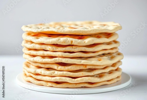 Neat stack of six whole wheat flatbreads, ready to serve, homemade, close up
