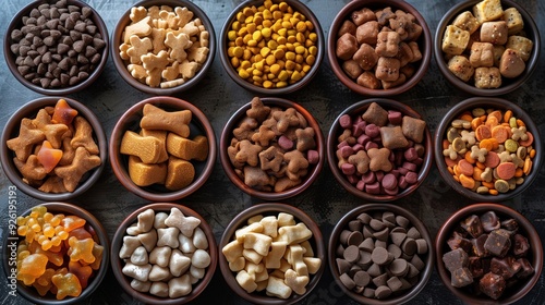 Neatly Arranged Assortment of Tasty Snacks in Bowls on Dark Background