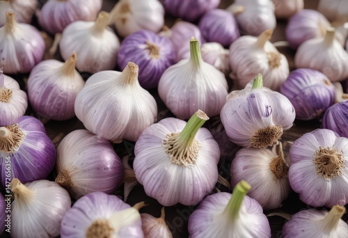 Neatly arranged fresh garlic bulbs, vibrant purple skins , garlic, food, high resolution