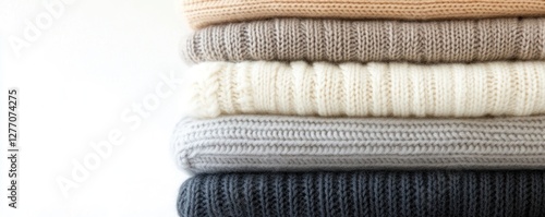 Neatly arranged stack of knitted sweaters in soft pastel colors highlights intricate cable patterns and rich textures. Perfect for adding warmth and style during the chilly season