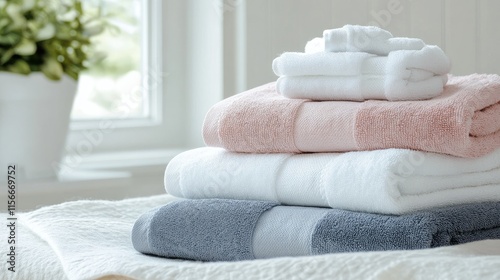 Neatly arranged towels in soft pastel colors on a comfortable bed with a serene background showcasing a cozy atmosphere.