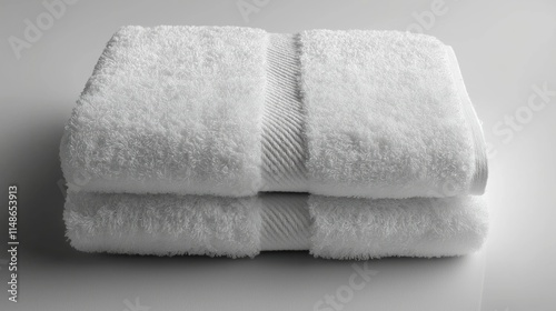 Neatly folded fluffy white towels on pristine white surface. Luxurious, clean bathroom product ready for spa hotel promotions. Ideal for wellness, relaxation themes. Simple product shot highlights