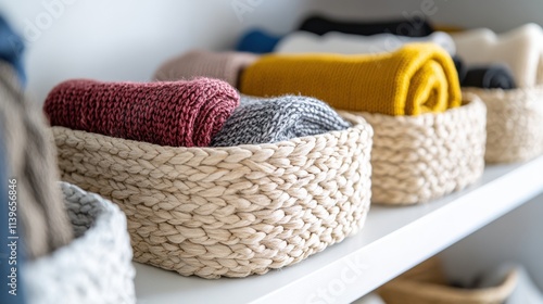 Neatly folded soft knitwear in woven baskets, arranged on shelves, evoking warmth and coziness in a tidy space.