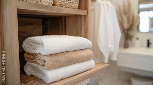 Neatly folded white and beige towels stacked on a wooden shelf, surrounded by woven baskets in a cozy, minimalist bathroom setting, evoking a sense of warmth and comfort.