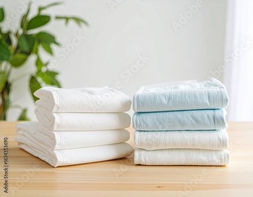 Neatly folded white and blue towels stacked on a wooden surface, creating a clean and organized composition.