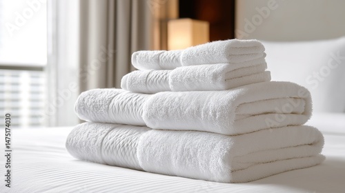 Neatly folded white towels on a hotel bed, embodying clean and inviting hospitality
