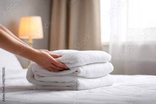 Neatly Folded White Towels on Bed, Cozy Atmosphere, Photography