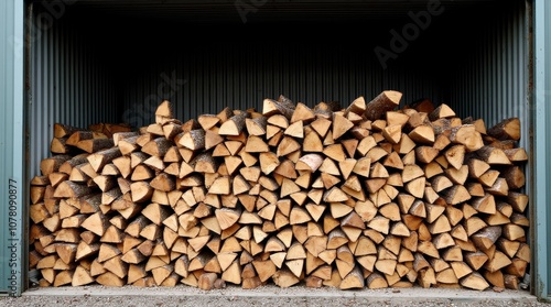Neatly Stacked Firewood Inside a Rustic Metal Shed