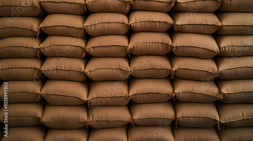 Neatly Stacked Sandbags in a Warehouse: Clear Display of Grain for Efficient Storage and Organisation.