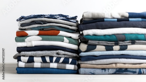 Neatly Stacked Sets of Colorful and Patterned Clothes on a Clean Background in a Modern Home Environment
