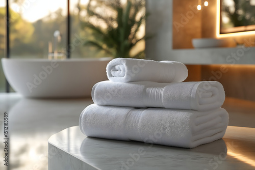 Neatly stacked white towels on a marble countertop in a modern bathroom setting.