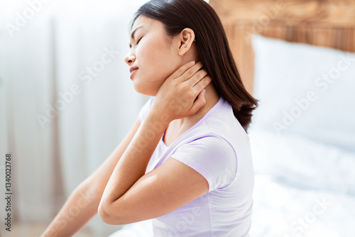 Neck Pain. Asian Woman Having Arthritis Massaging Aching Neck Sitting In Bed At Home.