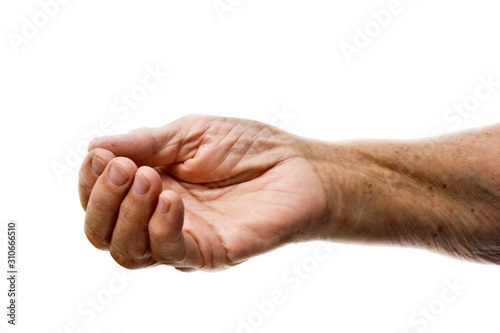 Needy old grandmother. Outstretched hand of a man close-up. Social difficulties and problems of old people. Good old palms of the grandmother