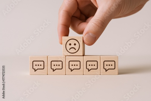 Negative Feedback Representation: Hand Placing Sad Face Block Atop Communication Bubbles, Symbolizing Customer Dissatisfaction