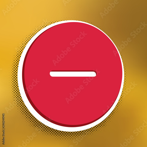 Negative symbol illustration. Minus sign. Vector. Magenta icon with darker shadow, white sticker and black popart shadow on golden background. Illustration.