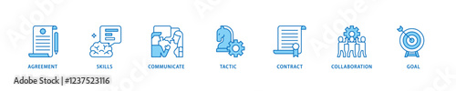 Negotiation icon set flow process which consists of skills, communicate, tactic, contract, and goal icon live stroke and easy to edit .