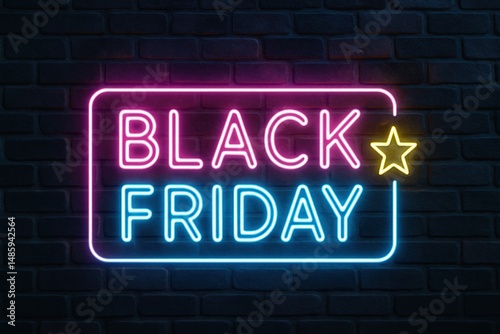 Neon Black Friday Sign Shining Brightly on Brick Wall, a Vivid Reminder of Shopping Deals and Discounts