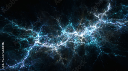 Neon blue and white fractal electricity branching through cosmic void, symbolizing natural energy.