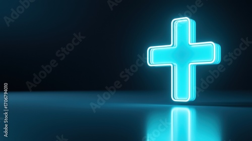 Neon blue cross illuminated against a dark background