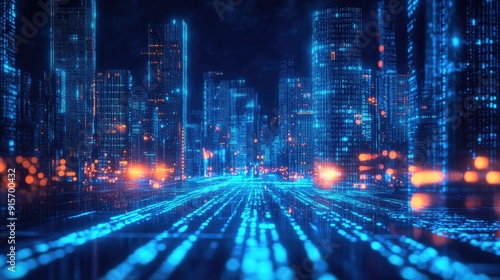 Neon blue illuminated city with streaming binary code. Depiction of digital innovation, data flow, and technological progress.