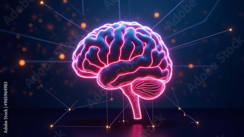 Neon Brain with Network Connections, glowing neon brain with web-like connections extending out from it