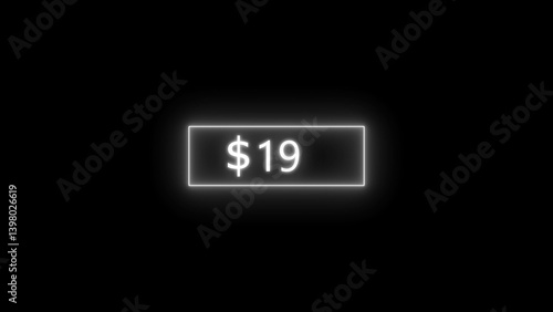 Neon bright USD Dollar growing from $19 cyan color illustration. Black background 4k illustration.