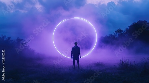 neon circle glowing fog atmospheric background, purple and blue colors, dreamlike scenery, mystical aura with clouds, abstract light concept, serene nighttime ambiance characters, 8k