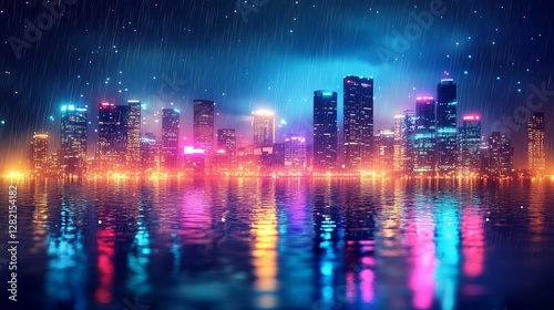 Neon city skyline with gradient hues of magenta to cyan, glowing reflections on rain-soaked streets, cyberpunk urban vibe