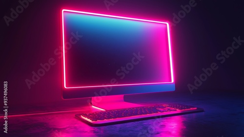 Neon computer setup with pink and blue lights, blending the sleek design of modern technology with vibrant, glowing accents.