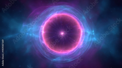 Neon cosmic vortex with glowing center, a surreal dance of pink and blue energy in deep space
