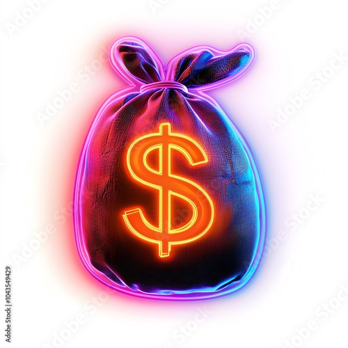 Neon dollar sign on a black bag, glowing against a white isolated background.