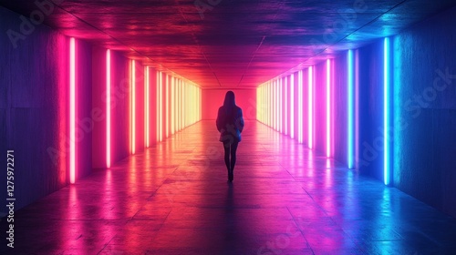 Neon Dreamscape: A Solitary Figure in a Vibrant, Futuristic Corridor