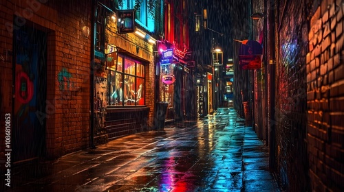 Neon Drenched Alleyway in Cyberpunk Inspired Urban Night Scene with Rainy Effect