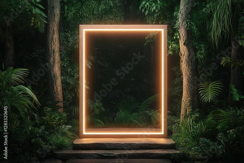 neon frame in the forest surrounded by dense greenery and trees
