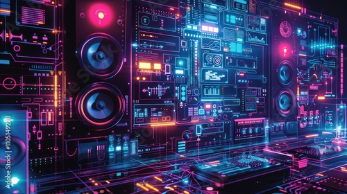 Neon futuristic music studio control panel with speakers and glowing interfaces.