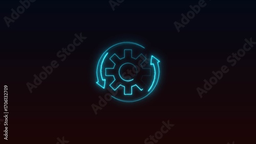 Neon Gear and Arrow Icon. Glowing Settings and Update Symbol on Black Background.