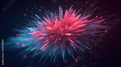 Neon geometric explosion with dynamic shards and glowing particles on dark background