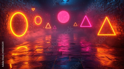 Neon Geometric Shapes in Futuristic Sci-fi Environment with Reflective Floor