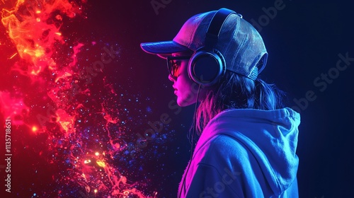 Neon Girl Listening Music Headphones Red Blue Light