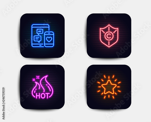 Neon glow lights. Set of Hot sale, Social media and Copyright protection icons. Rank star sign. Shopping flame, Mobile devices, Shield. Best result. Neon icons. Glowing light banners. Vector