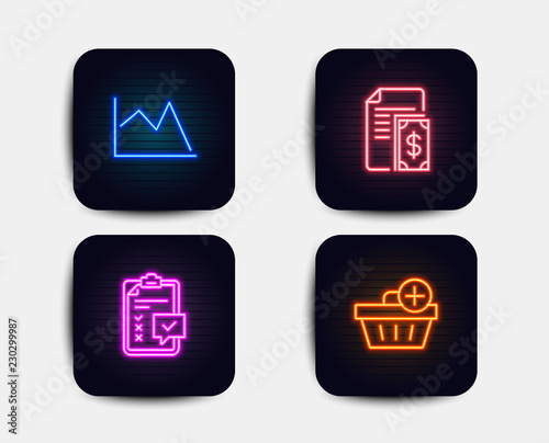 Neon glow lights. Set of Line graph chart, Payment and Checklist icons. Add purchase sign. Financial graph, Cash money, Survey. Shopping order. Neon icons. Glowing light banners. Vector