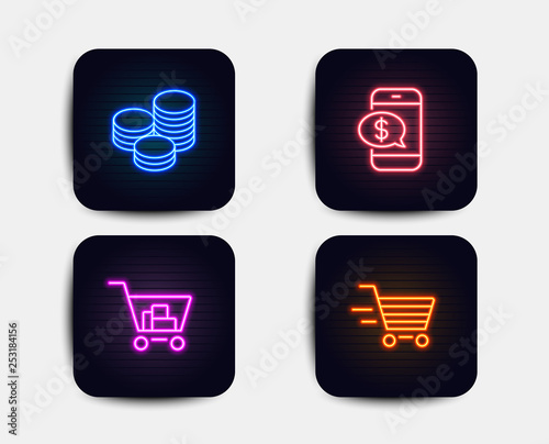 Neon glow lights. Set of Tips, Phone payment and Internet shopping icons. Delivery shopping sign. Cash coins, Mobile pay, Cart with purchases. Online buying. Neon icons. Glowing light banners. Vector