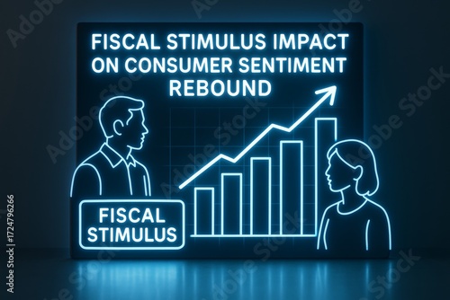 Neon glowing chart illustrating fiscal stimulus impact on rising consumer sentiment with silhouettes and growth bars on dark background light concept. Ai generative
