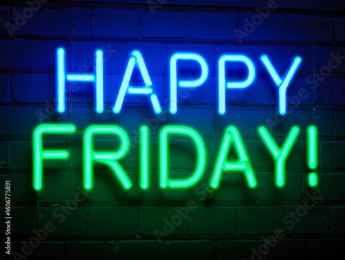 Neon glowing Happy Friday sign in blue and green colors on dark brick wall background.